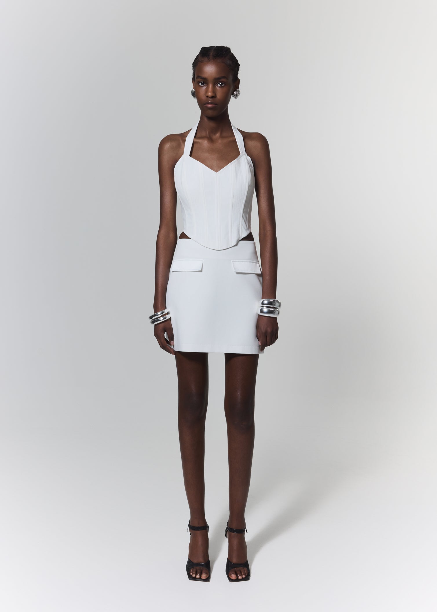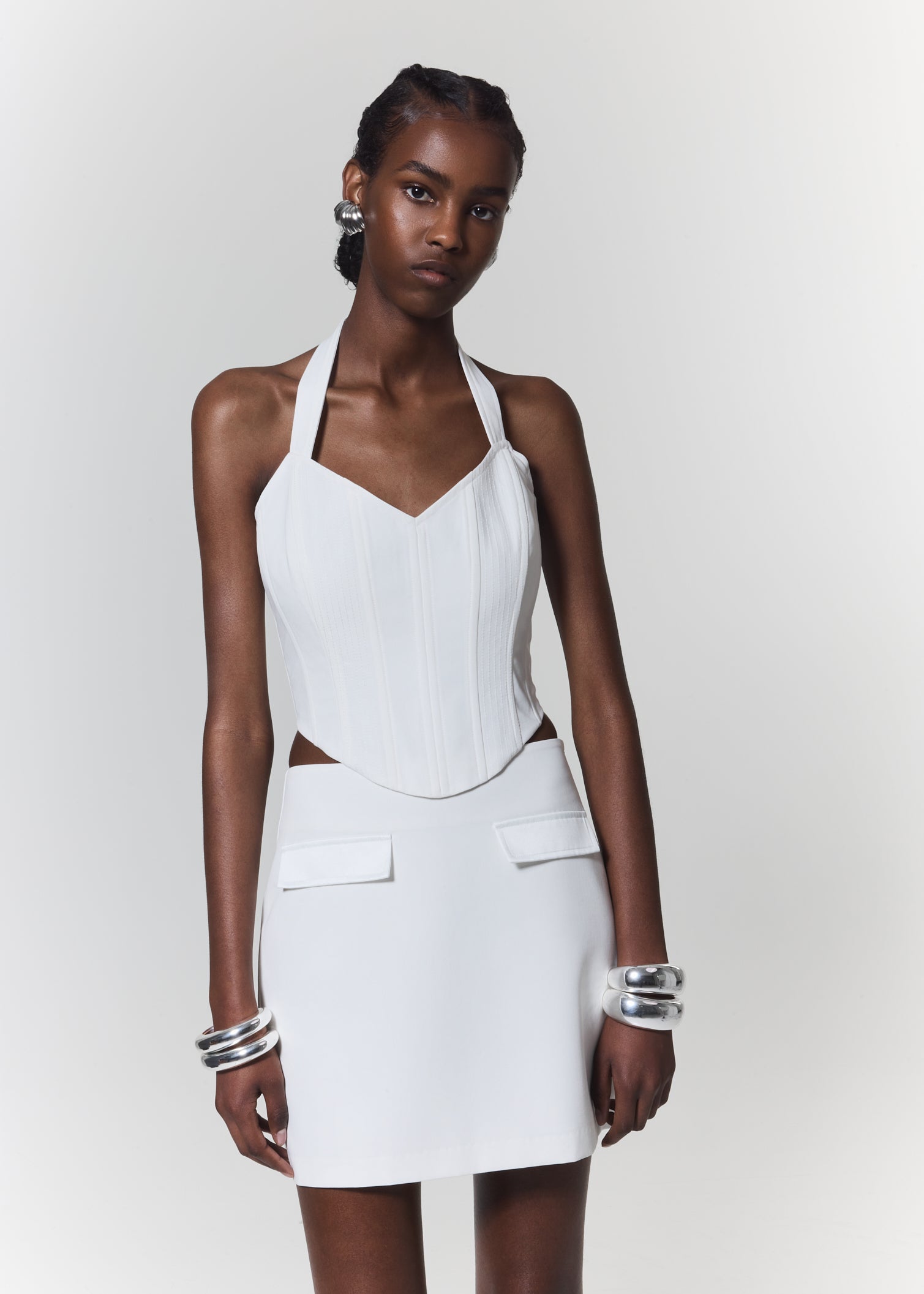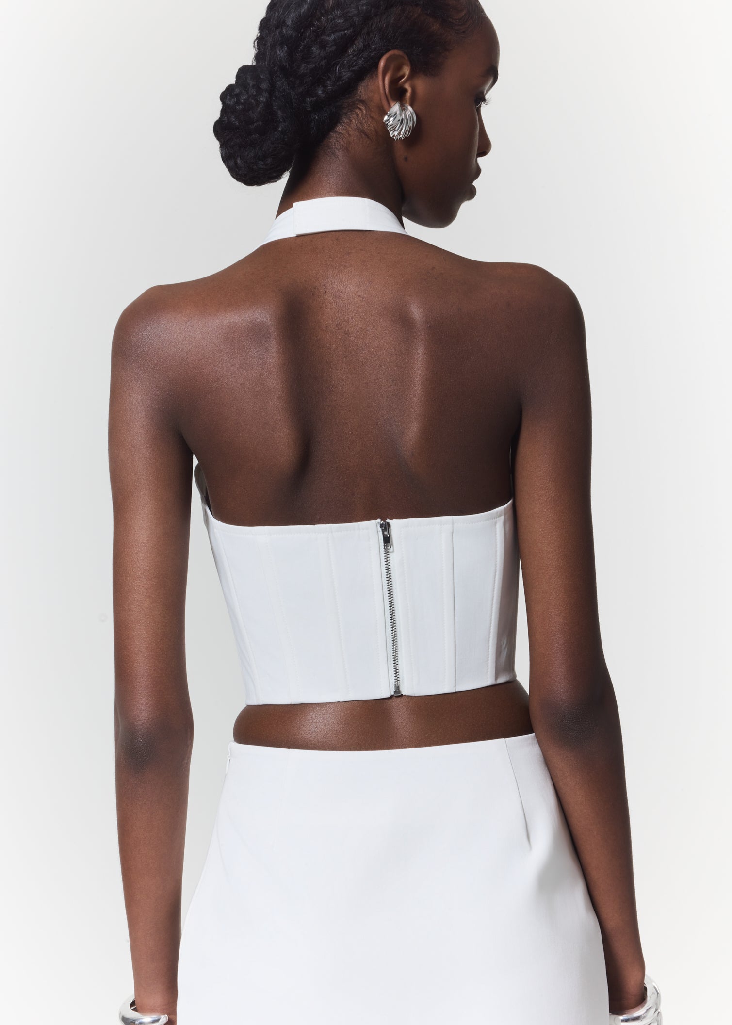Dit corset topje is een echte blikvanger: vrouwelijk, strak en perfect afgewerkt. Het is ontworpen met een elegante halternek die je zelf op maat kunt verstellen dankzij de handige klittenbandsluiting aan de hals. Zo bepaal je eenvoudig zelf de ideale lengte en pasvorm.