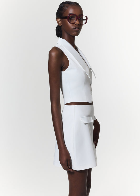 Deze cropped top straalt verfijning en kracht uit dankzij de strakke snit en luxueuze afwerking. Het ontwerp zonder mouwen laat de schouders mooi vrij en benadrukt de elegante lijn van de brede, glanzende satijnen kraag. De beklede knopen aan de voorzijde zorgen voor een klassiek detail dat perfect in balans is met het moderne silhouet.