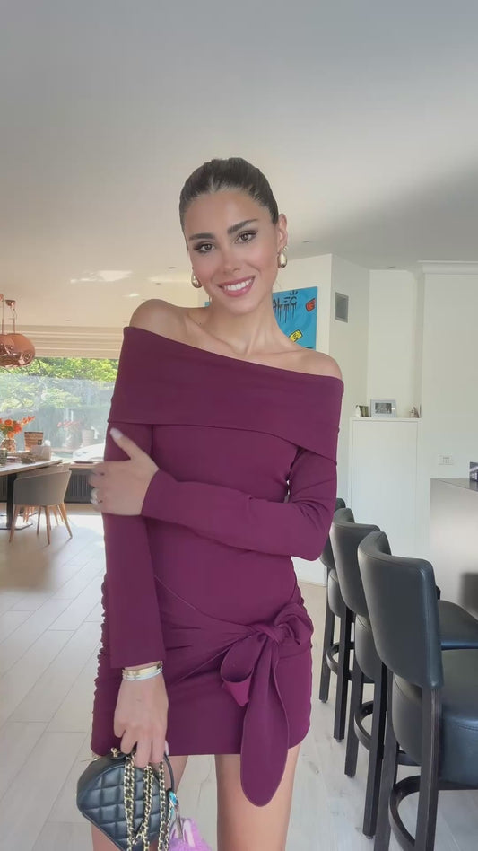 Make a bold and elegant statement with our Burgundy Off-Shoulder Knot Dress, the ultimate blend of sophistication and allure. This figure-hugging dress features a rich burgundy hue that flatters every skin tone and adds a touch of refined drama to your look. The off-shoulder neckline beautifully frames your décolletage, while the ruched design enhances your natural curves for a sculpted silhouette.