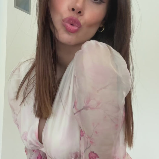 Embracing the timeless beauty of simplicity and grace in this floral pink lantern sleeve dress.