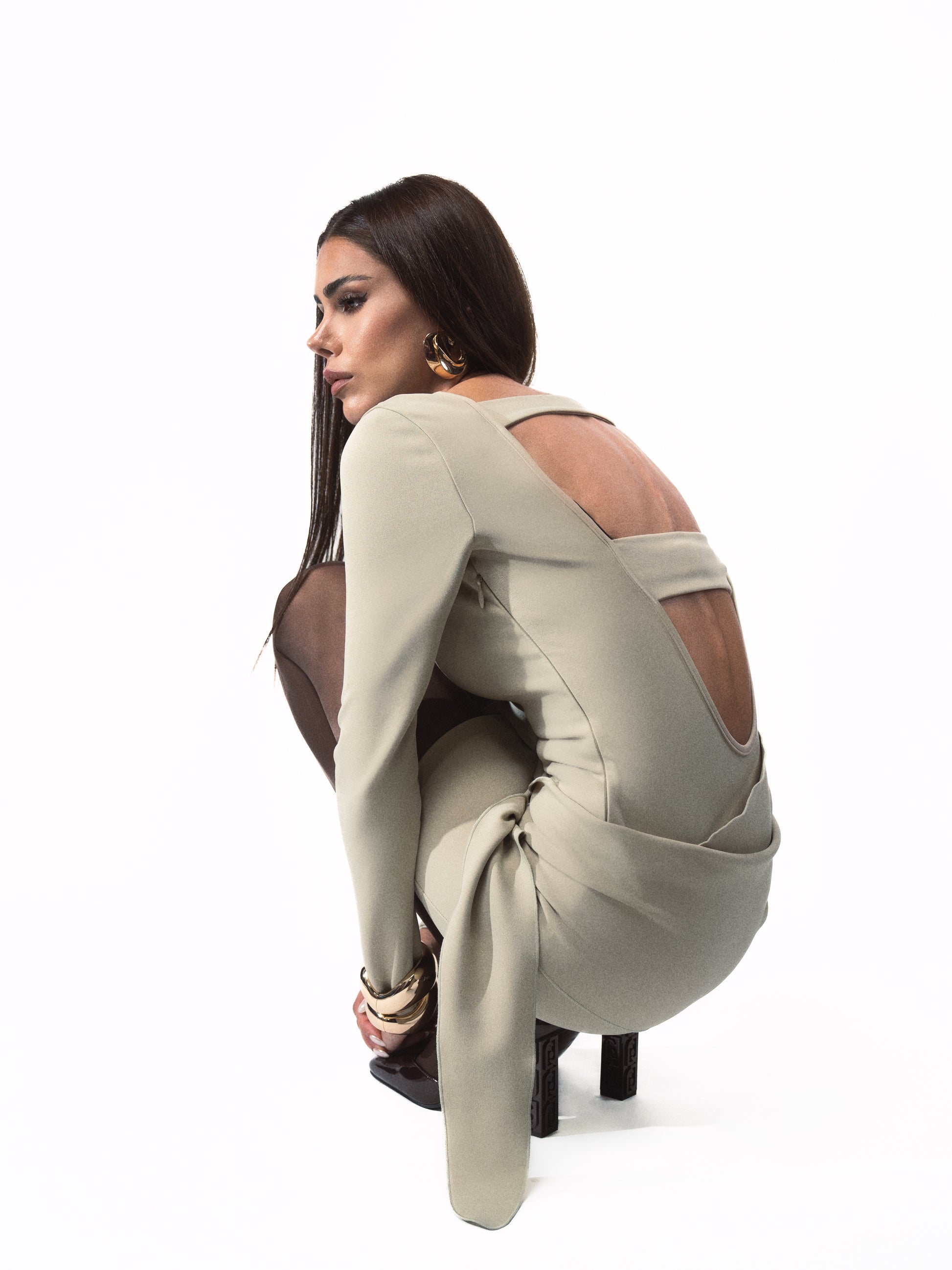 Turn heads and own the night in our Sand Ruched Knot Dress, where elegance meets bold detail. Crafted in a soft sand tone, this dress features a sleek bodycon fit with long sleeves and a high neckline at the front, balanced beautifully by its striking open back design with two delicate straps.