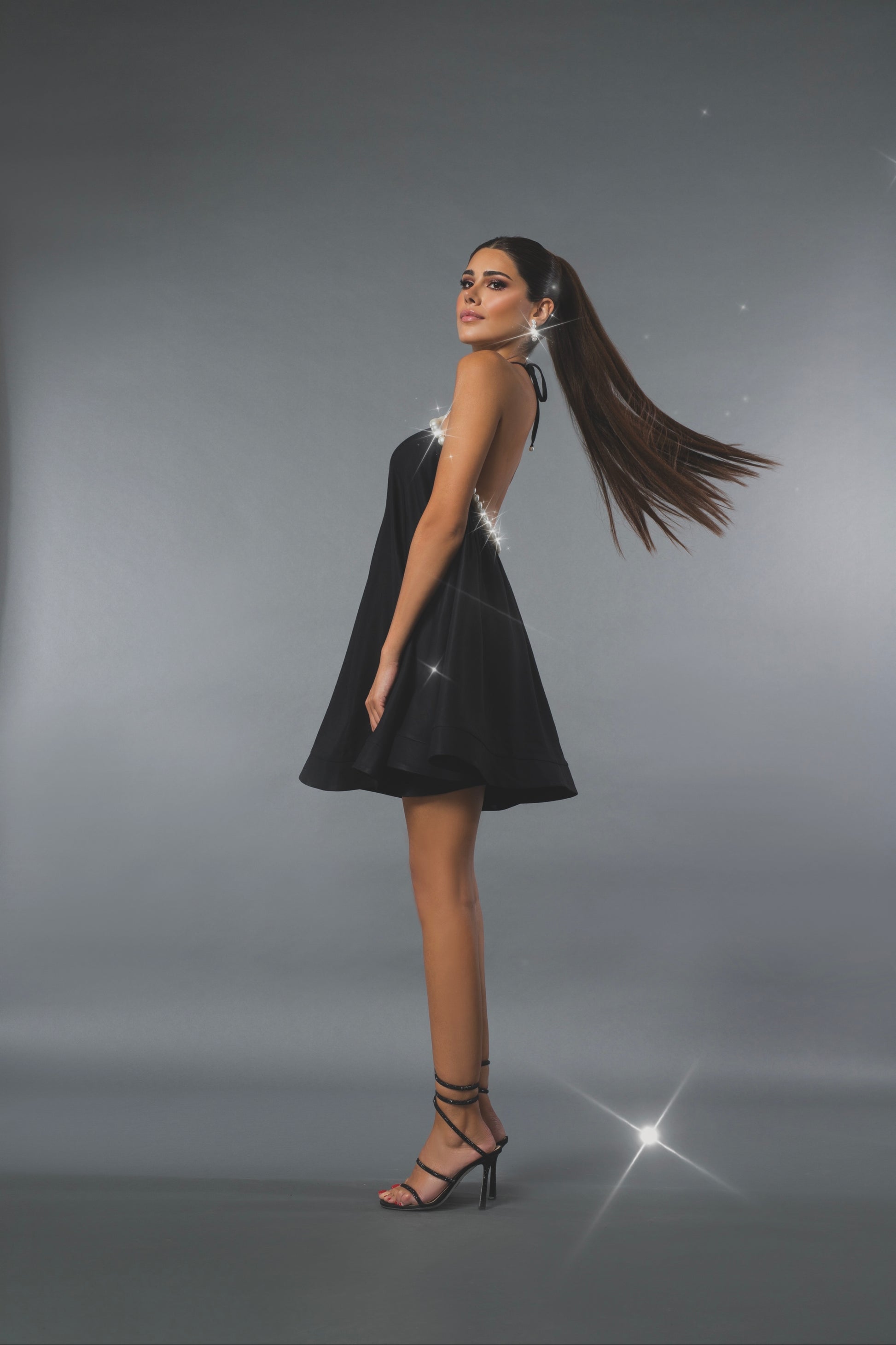 This white pearls black dress featuring a pearl embellished cord going around the neckline. This dress is a total eye-catcher !